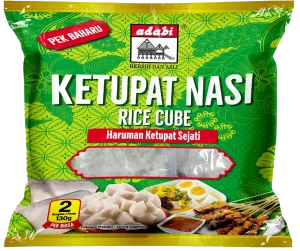 Bungkusan nasi impit Adabi sedia untuk dimasak. Ia mengandungi aroma wangi daun kelapa. Mudah dan senang untuk disediakan.