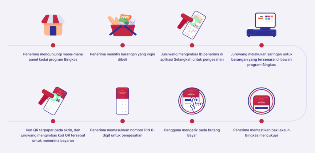 - e-Wallet BINGKAS boleh digunakan di kedai serta pasaraya yang berdaftar.