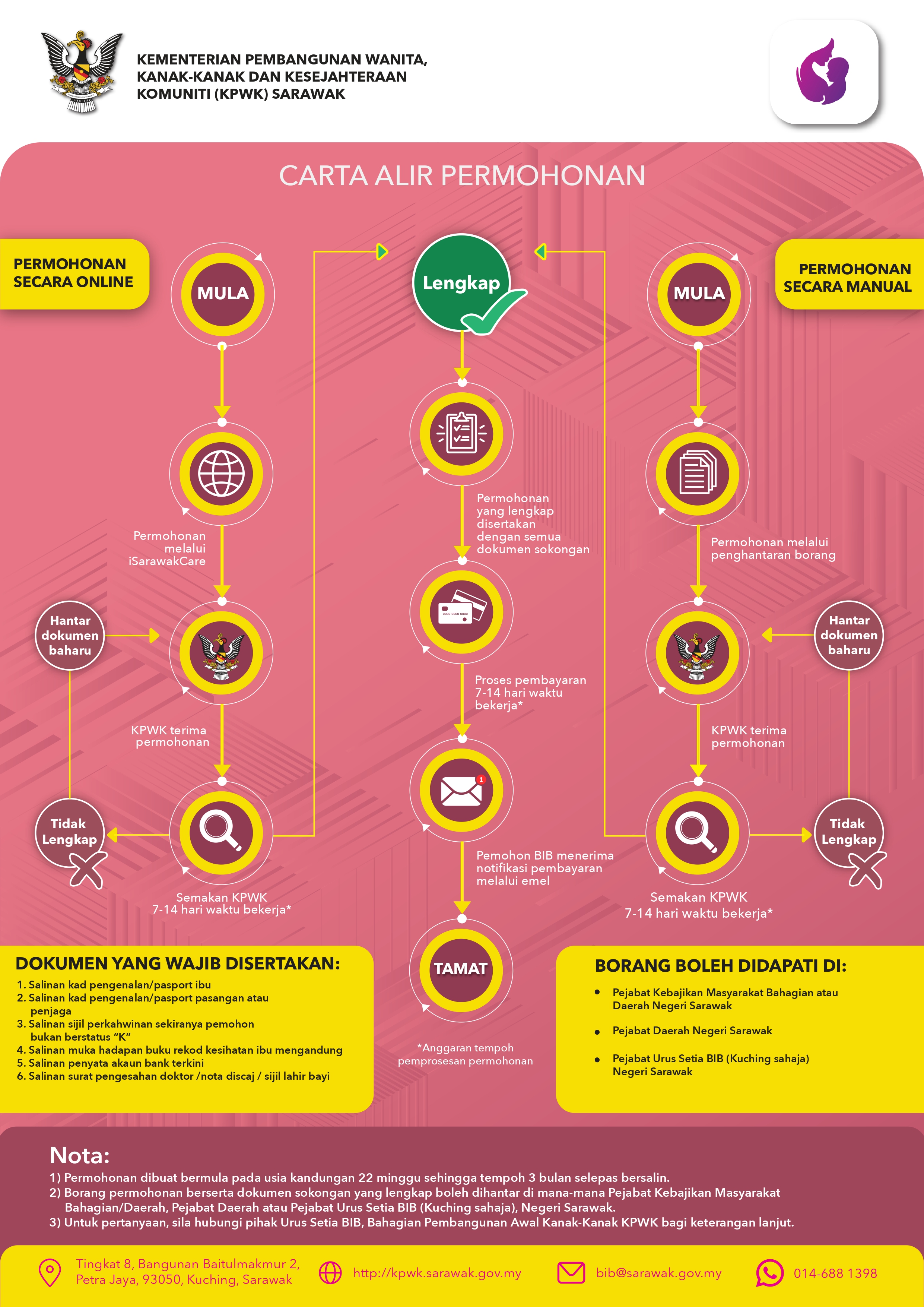 Untuk sebarang pertanyaan, sila hubungi Urus Setia Bantuan Ibu Bersalin pada nombor 082-442050 atau melalui e-mel bib@sarawak.gov.my.