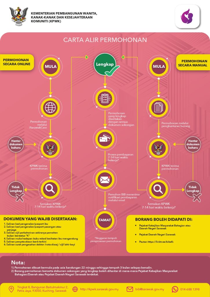 Untuk sebarang pertanyaan atau maklumat tambahan, sila hubungi Urus Setia Bantuan Ibu Bersalin BIB melalui e-mel di bib@sarawak.gov.my.