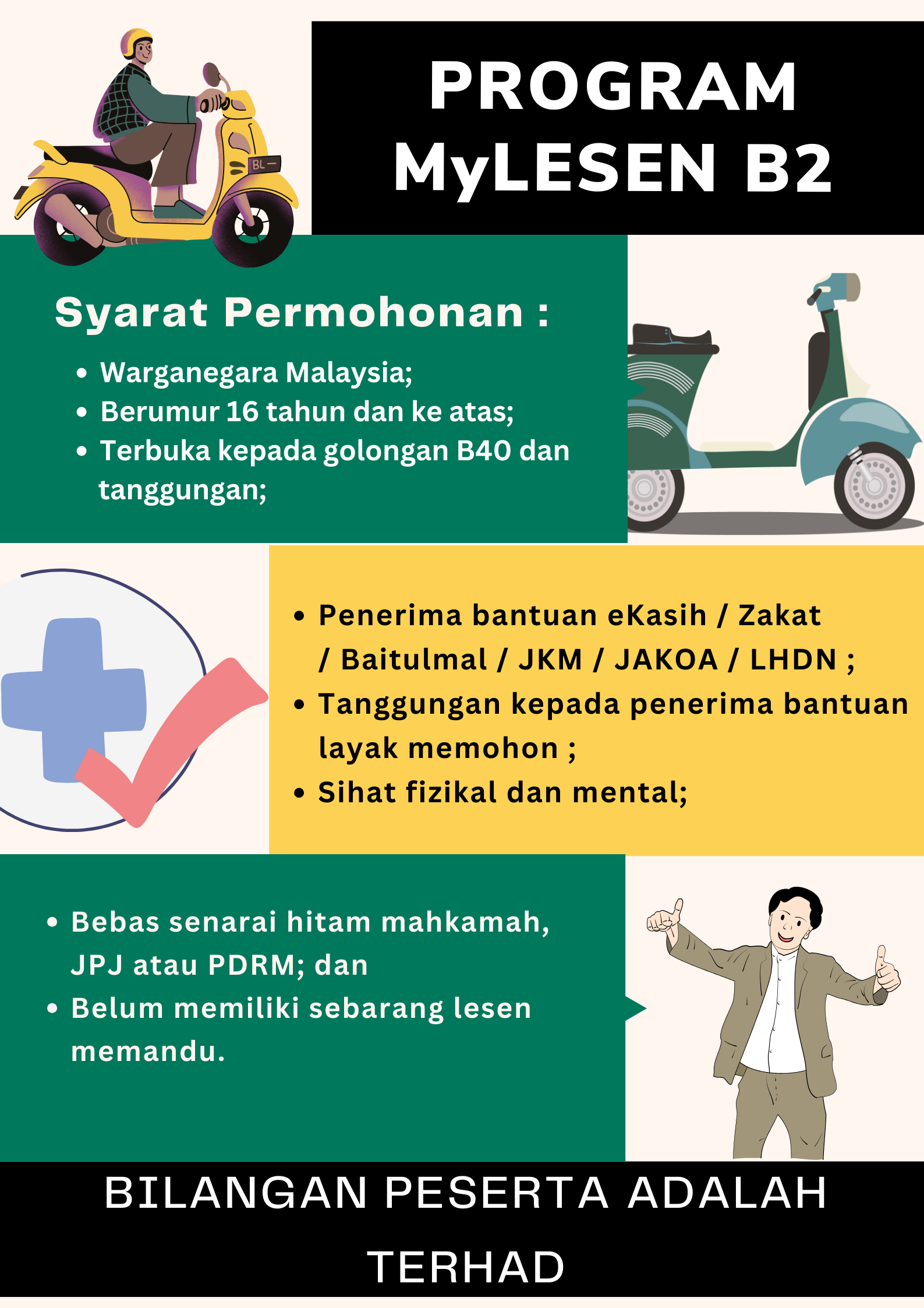 Untuk sebarang pertanyaan lanjut mengenai Program MyLesen B2, sila hubungi Bahagian Pelesenan Pemandu JPJ Negeri Melaka di talian 06-251 4049/4050.
