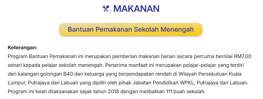 - Ihsan MADANI – Bantuan Pemakanan Sekolah Menengah: https://ihsanmadani.gov.my/inisiatif/makanan/bantuan-pemakanan-sekolah-menengah