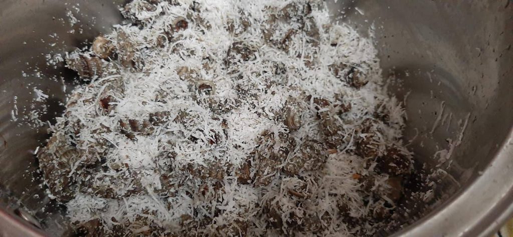 Selain membersihkan kerang, hampas kelapa juga boleh digunakan untuk membersihkan siput sedut.