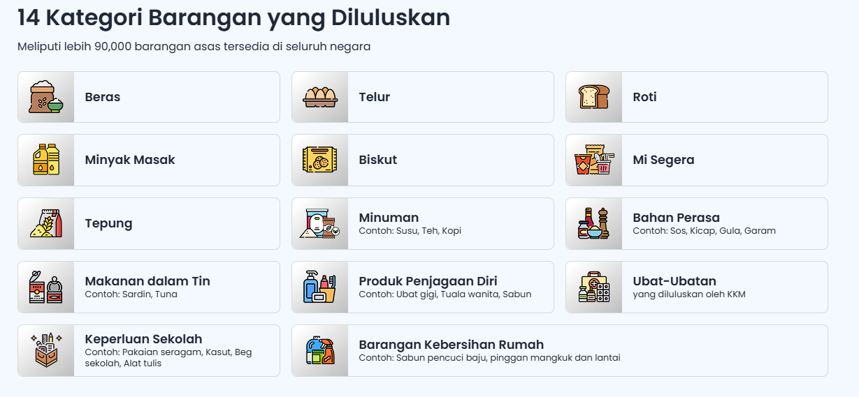 | Makanan Asas | Beras, gula, minyak masak, tepung, susu, telur, dan lain-lain |