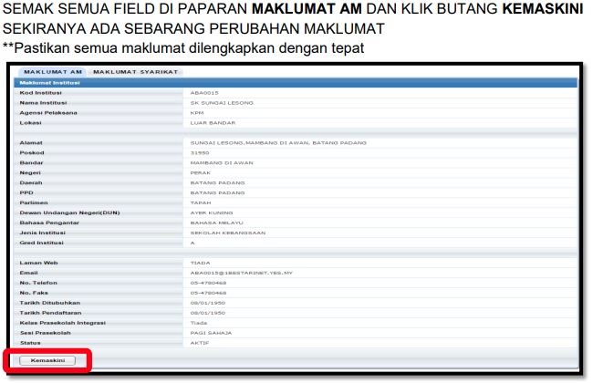 Selepas log masuk, klik pada menu ‘Institusi’ untuk membuat semakan dan kemaskini maklumat institusi anda. Semak semua maklumat yang tersenarai dan pastikan kebenaran maklumat tersebut sebelum mengesahkan.