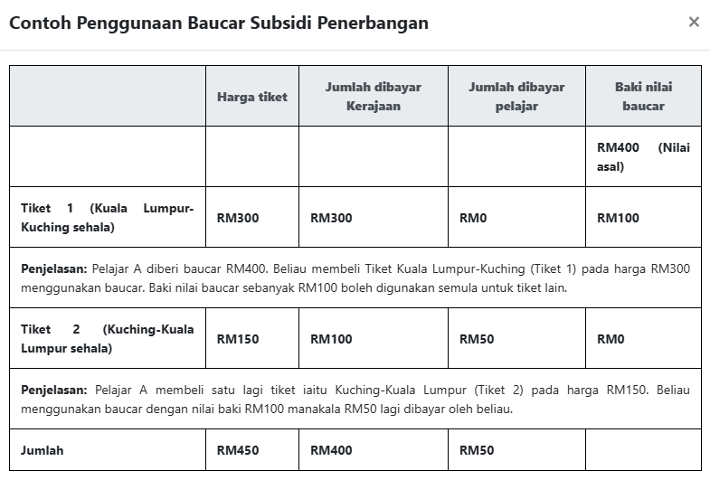 | Harga Tiket | Jumlah Dibayar Kerajaan | Jumlah Dibayar Pelajar | Baki Nilai Baucar |