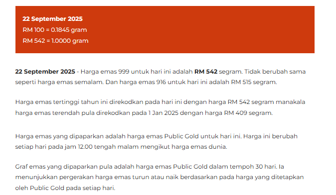 - Harga emas Public Gold terkini sebanyak RM 542/gram untuk GAP 24K (22 Sep 2025). (Public Gold Malaysia)