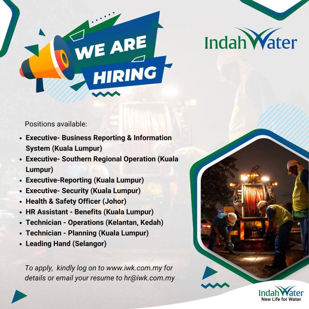 | 1. EXECUTIVE 2. HEALTH & SAFETY OFFICER 3. HR ASSISTANT 4. TECHNICIAN 5. LEADING HAND | MAJIKAN: INDAH WATER KONSORTIUM SDN. BHD KELAYAKAN MINIMA: SPM/DIPLOMA/IJAZAH TUTUP PERMOHONAN: RUJUK IKLAN PURATA GAJI: RM2,000 – RM4,200 |