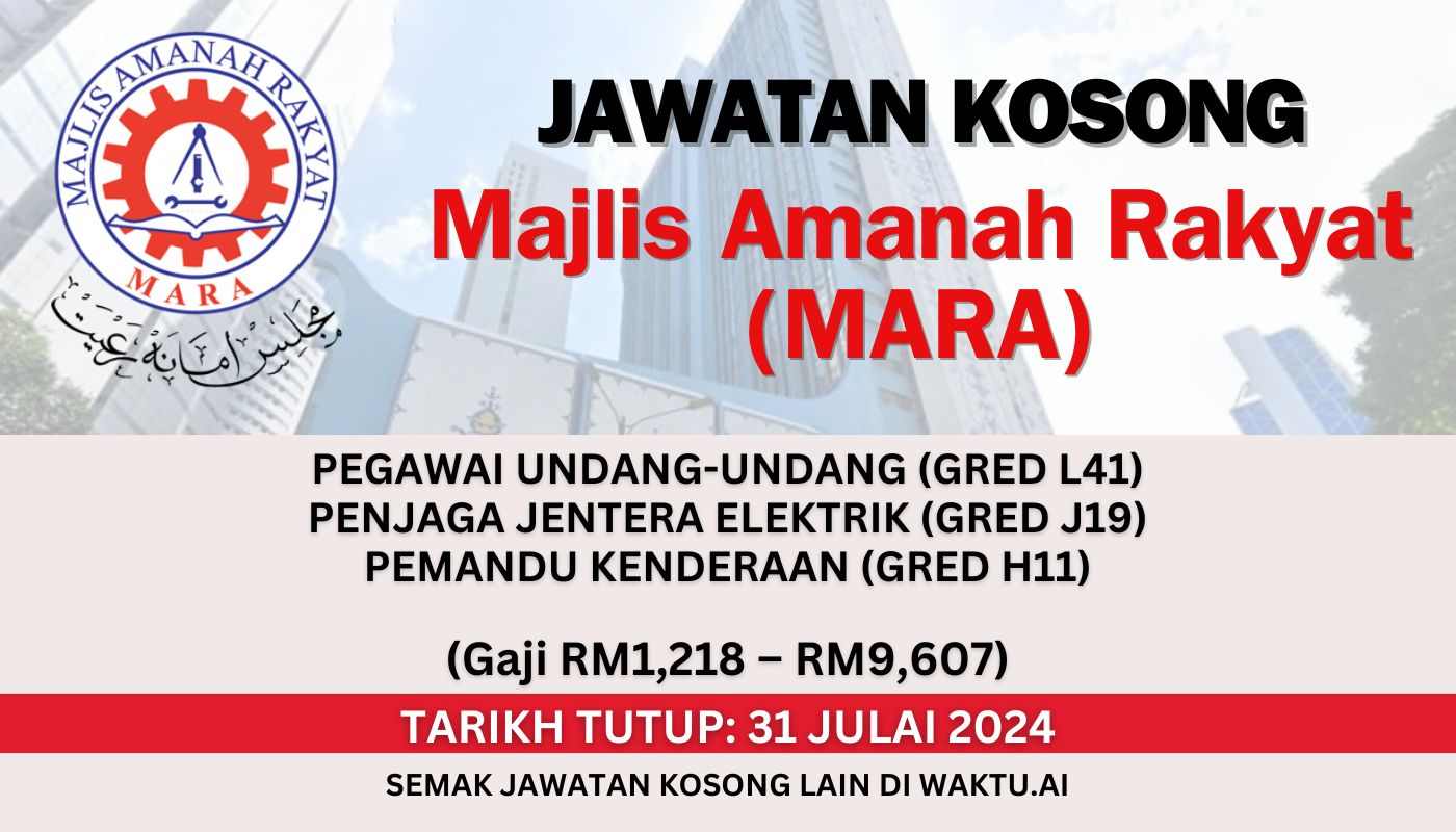 Rujuk iklan penuh jawatan kosong di sini: https://www.mingguankerja.my/wp-content/uploads/2024/07/MARA-JULAI-2024.pdf