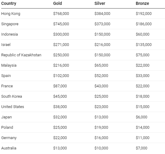 Singapura memberi ganjaran kepada pemenang pingat Olimpik dengan 1 juta dolar Singapura ($745,300) untuk emas, SG$500,000 untuk perak, dan SG$250,000 untuk gangsa. Hanya satu atlet yang pernah menerima bonus tunai tertinggi tersebut: Joseph Schooling.