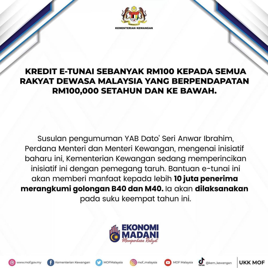 Datuk Seri Anwar Ibrahim (Perdana Menteri Malaysia) telah mengumumkan bahawa Kerajaan bakal menawarkan kredit e-tunai sebanyak RM100 kepada kesemua rakyat dewasa di Malaysia yang mempunyai pendapatan tahunan sebanyak RM100,000 ke bawah.