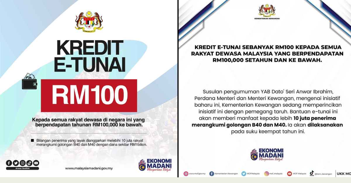 Datuk Seri Anwar Ibrahim (Perdana Menteri Malaysia) telah mengumumkan bahawa Kerajaan bakal menawarkan kredit e-tunai sebanyak RM100 kepada kesemua rakyat dewasa di Malaysia yang mempunyai pendapatan tahunan sebanyak RM100,000 ke bawah.