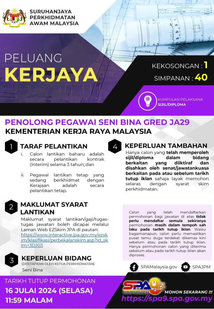 | 1. PENOLONG PEGAWAI SENIBINA GRED JA29 | MAJIKAN: JABATAN KERJA RAYA (JKR) KEKOSONGAN: PELBAGAI NEGERI KELAYAKAN MINIMA: SPM/DIPLOMA/IJAZAH TUTUP PERMOHONAN: 16 JULAI 2024 PURATA GAJI: RM1,549 – RM5,701+ |