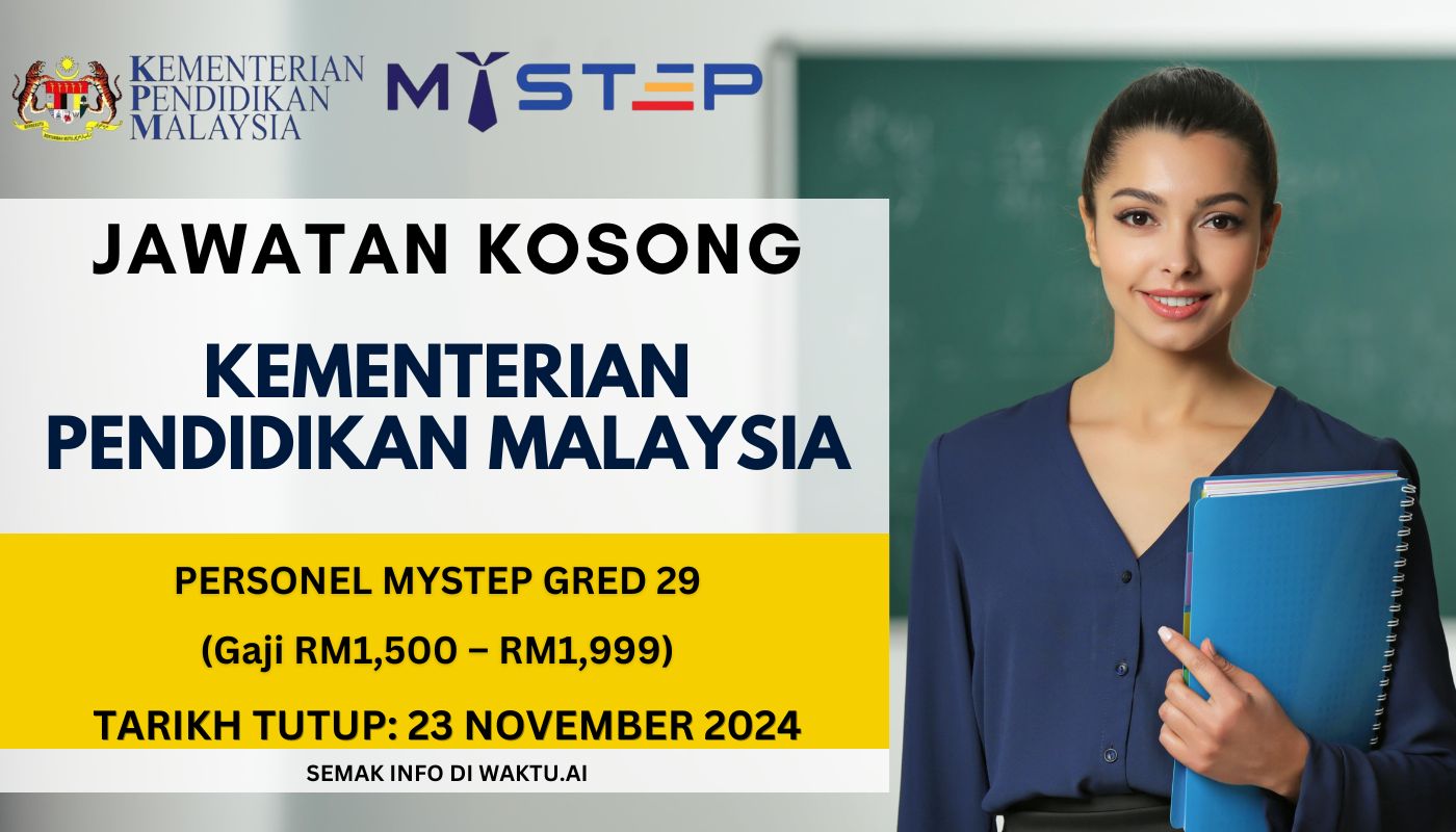 1. PERSONEL MYSTEP GRED 29 | MAJIKAN: KEMENTERIAN PENDIDIKAN MALAYSIA (KPM) KEKOSONGAN: PUTRAJAYA KELAYAKAN MINIMA: DIPLOMA & IJAZAH TUTUP PERMOHONAN: 23 NOVEMBER 2024 PURATA GAJI: RM1,500 – RM1,999 |