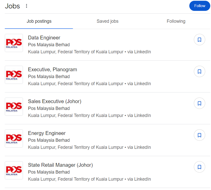 | Data Engineer Executive, Planogram Sales Executive (Johor) Energy Engineer State Retail Manager (Johor) National Account Manager (Government & GLC) – Kuala Lumpur Head of Analytics & Business Insights – Kuala Lumpur Head of Insurance – Kuala Lumpur Marketing Manager, Pos Shop – Kuala Lumpur | MAJIKAN: POS MALAYSIA BERHAD KEKOSONGAN: SELURUH NEGARA KELAYAKAN MINIMA: SPM/SKM/DIPLOMA/IJAZAH TUTUP PERMOHONAN: SEPTEMBER 2024 PURATA GAJI: RM1,500 – RM12,000+ |
