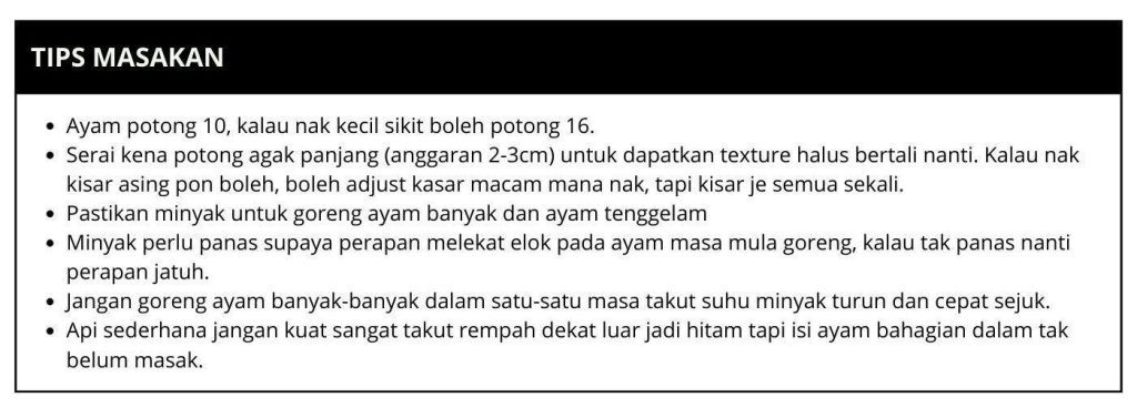 - Goreng di atas api sederhana kerana jika api kuat nanti ayam masak hitam di luar tetapi di dalamnya masih mentah.