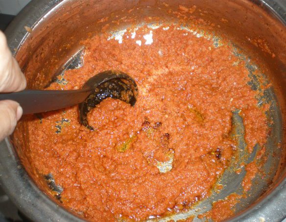 - Masukkan bahan kisar halus dan kacau sehingga pecah minyak. Boleh tambah sedikit air jika takut hangus.