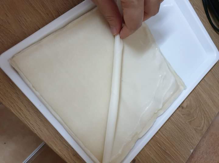 - Gunting gulungan kulit popia secara menyerong dalam jarak 1.5cm.