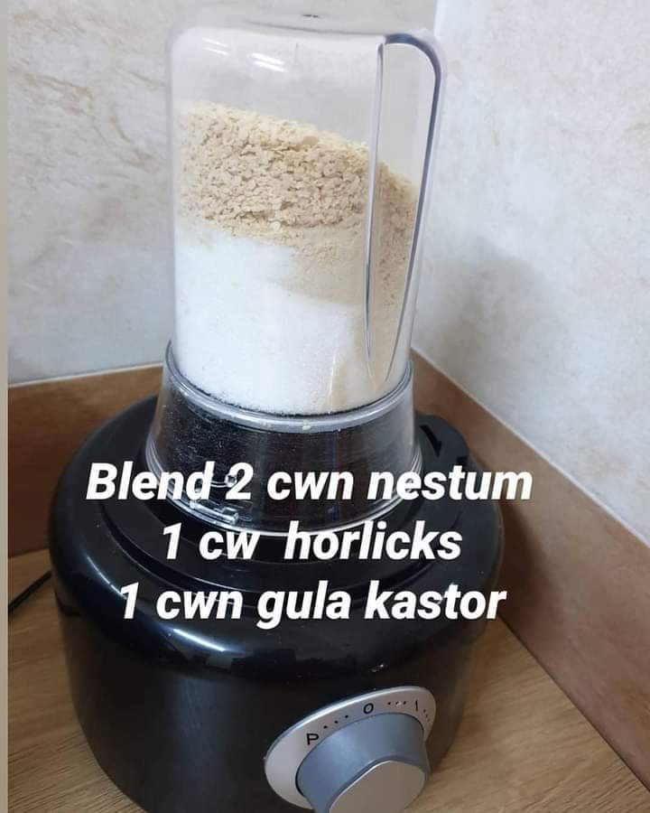 Caranya, ambil 2 cawan Nestum + 1 cawan susu tepung + 1 cawan gula + garam = kisar halus dan gebu semua bahan guna blender.