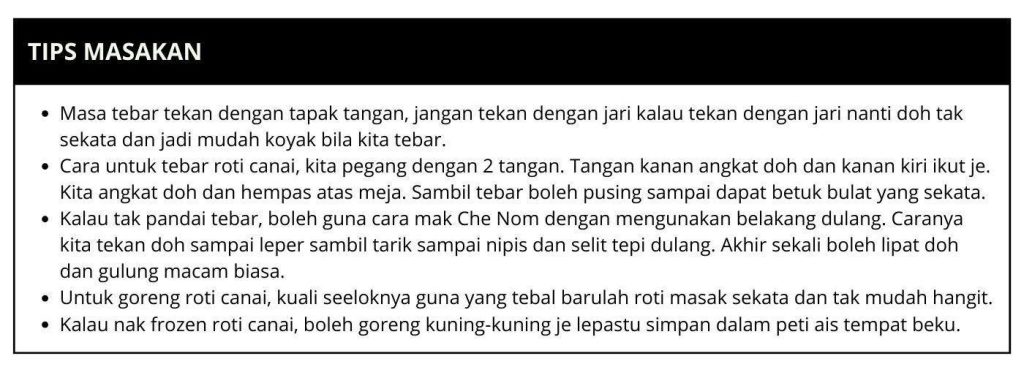 Resepi ini telah disempurnakan dari generasi ke generasi dan mencerminkan kepelbagaian budaya dan keharmonian yang menjadi asas masyarakat Malaysia. Roti Canai boleh dinikmati untuk sarapan pagi atau pada bila-bila masa, dengan setiap suapan menawarkan gabungan rasa yang lembut daripada manis kepada pedas.