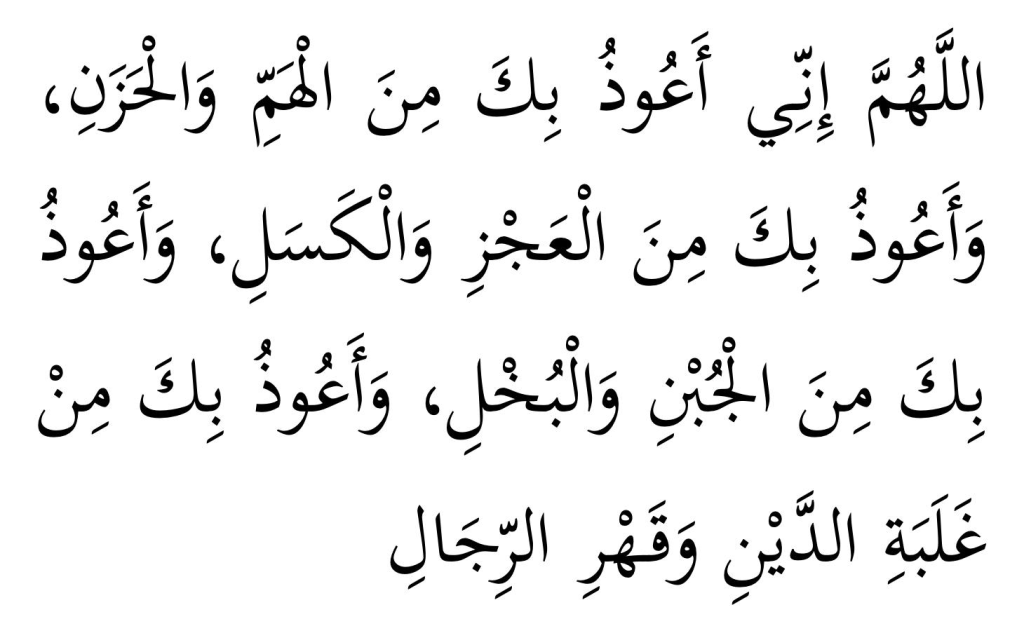 Allāhumma Innī AʿUzuBika Minal-Hammi Wal-Ḥazan, Wa AʿUuzuBika Minal-ʿAjzi Wal-Kasal, Wa AʿUuzuBika Minal-Jubni Wal-Bukhl, Wa AʿUuzuBika Min Ghalabatid-Dayni Wa Qahrir-Rijāl