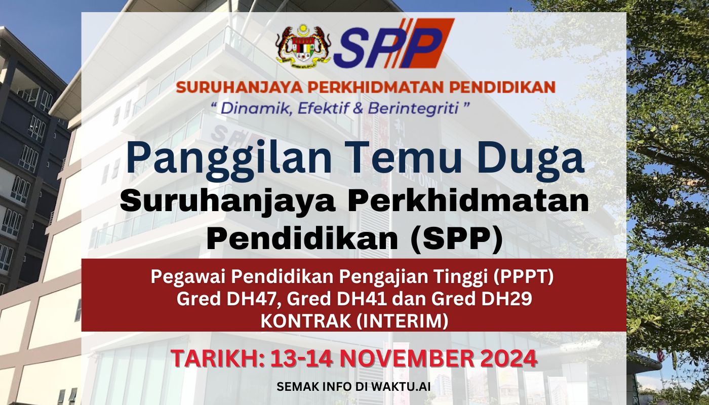 Merujuk kepada iklan yang bertarikh 3 hingga 17 September 2024, Suruhanjaya Perkhidmatan Pendidikan (SPP) akan melaksanakan sesi temu duga bagi jawatan Pegawai Pendidikan Pengajian Tinggi (PPPT) Gred DH47, Gred DH41, dan Gred DH29 untuk lantikan secara kontrak (interim) di Semenanjung Malaysia pada 13 hingga 14 November 2024.